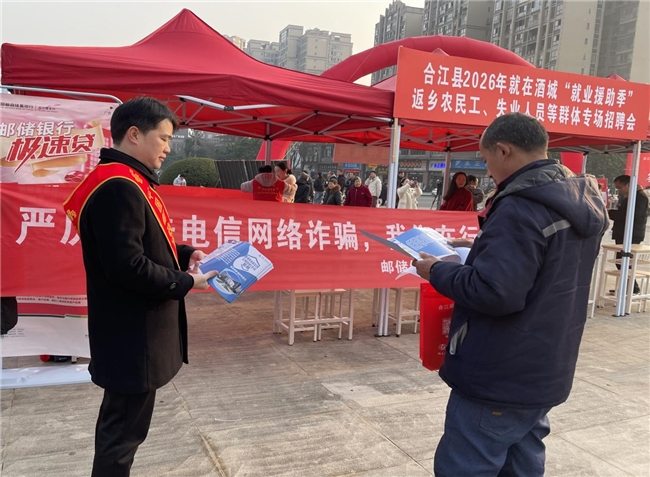 近日,邮储银行合江县支行以合江县荔城文化广场举办的2026年就在酒城“就业援助季”专场招聘会为契机,开展“就业护航·反诈同行”反诈宣传活动,为返乡农民工、失业人员等求职群体筑牢金融安全防线。